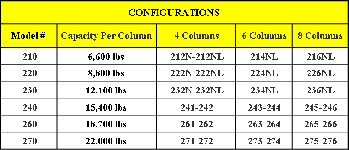 6 Models with capacities ranging from 6,500 to 22,000 pounds per column.